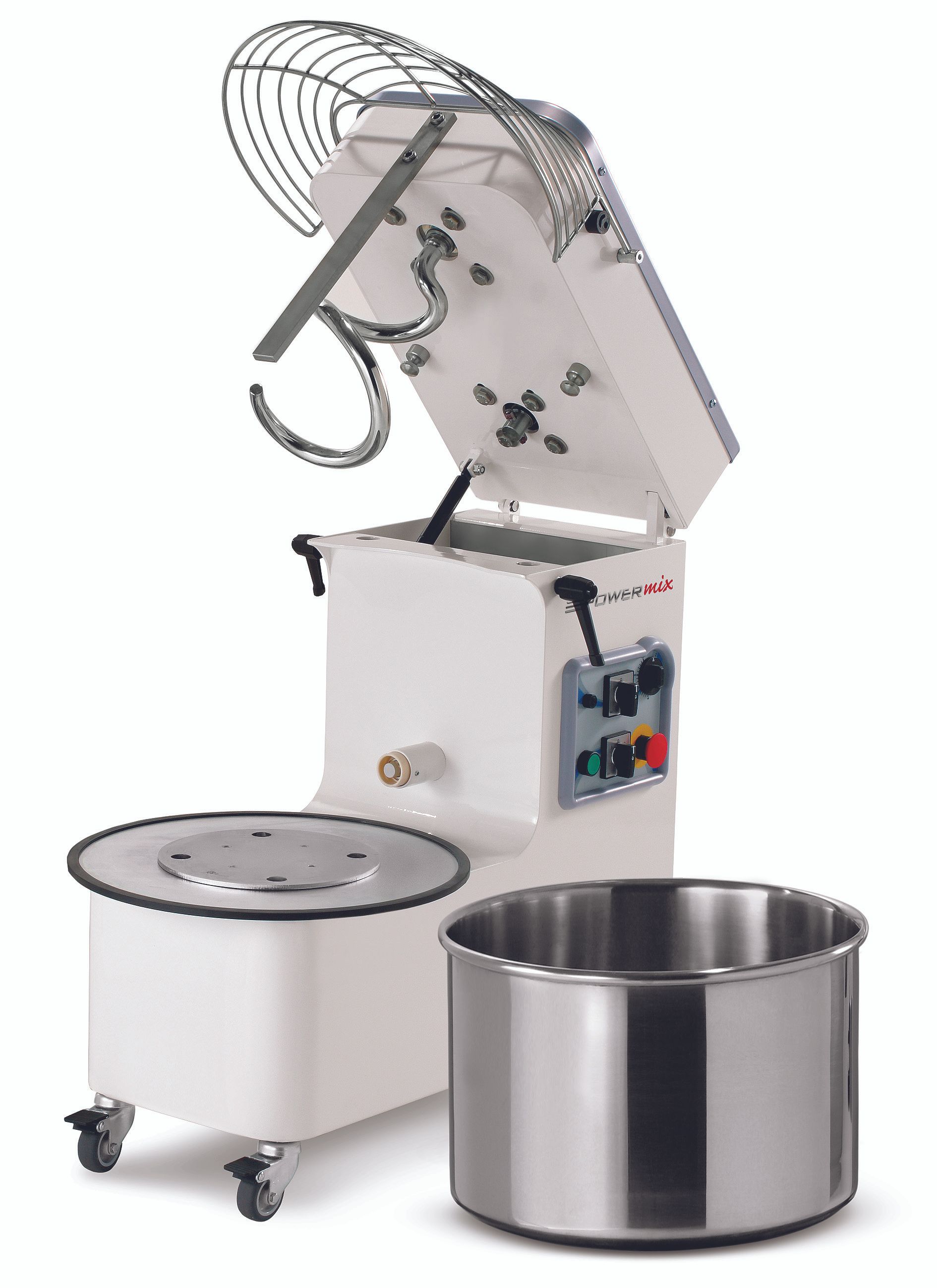 The mixer is supplied with castors for easy mobility. A key safety feature includes the requirement of a minimum water to flour ratio of 50%, reducing the risk of overly dense or hard dough that could damage the mixer. Additionally, users are advised to avoid wearing hanging clothes that might get caught in the machine for their safety.