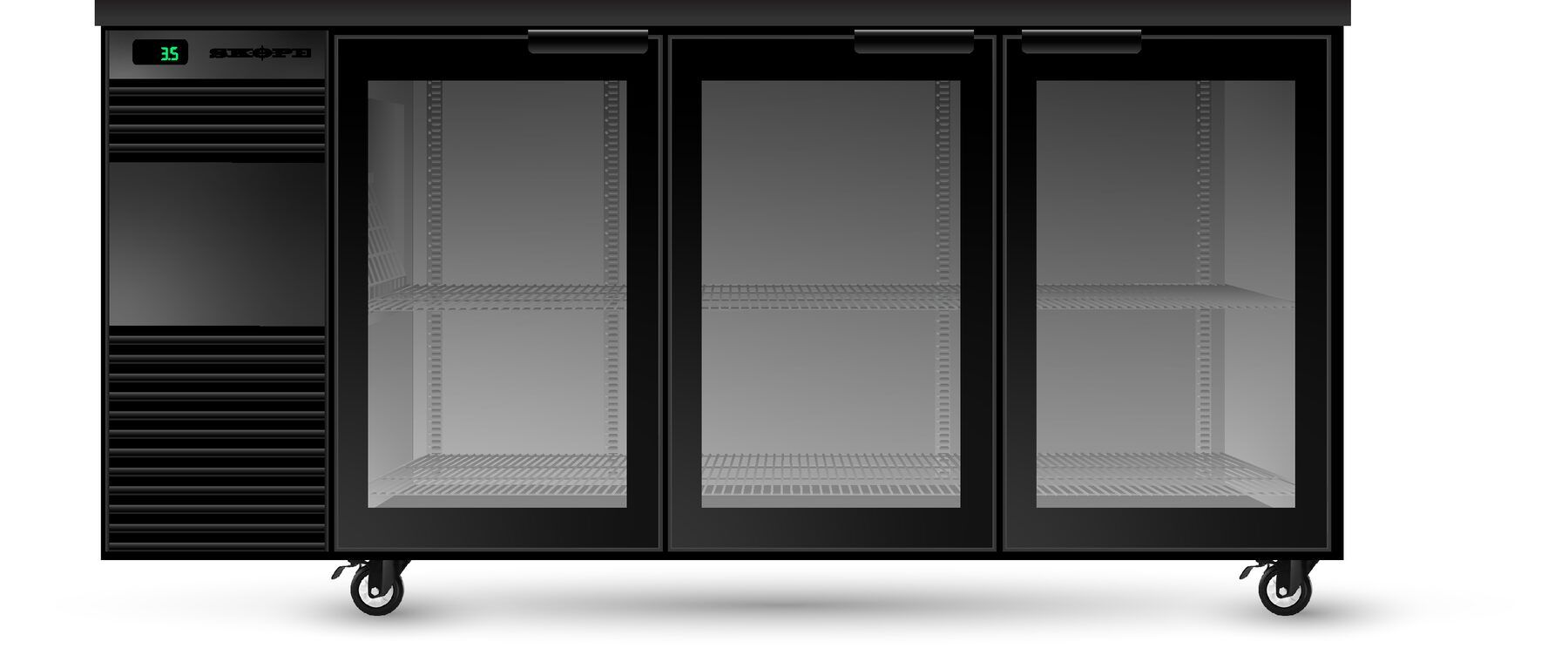 Quiet, high efficiency premium three glass swing door bar fridge featuring dimmable LED lights, lockable doors, and eco-friendly natural refrigerant technology. It is well suited to restaurants / cafes / clubs / pubs / bars / quick service restaurants.