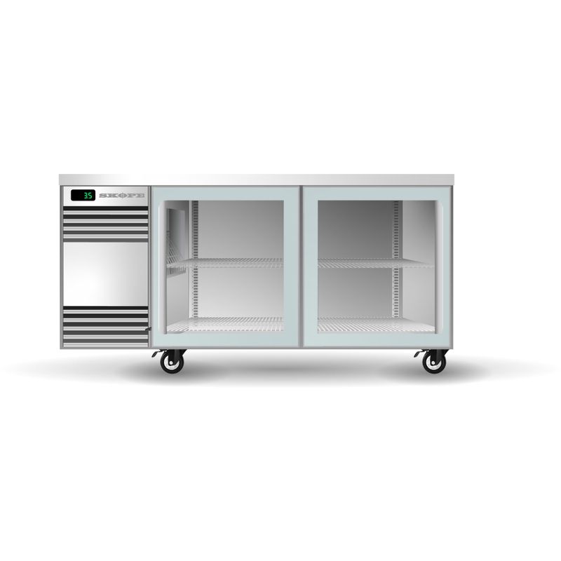 Low height premium two sliding door bar fridge featuring dimmable LED lights, and eco-friendly natural refrigerant technology. Designed to fit under the bar. It is well suited to restaurants / cafes / clubs / pubs / bars / quick service restaurants.